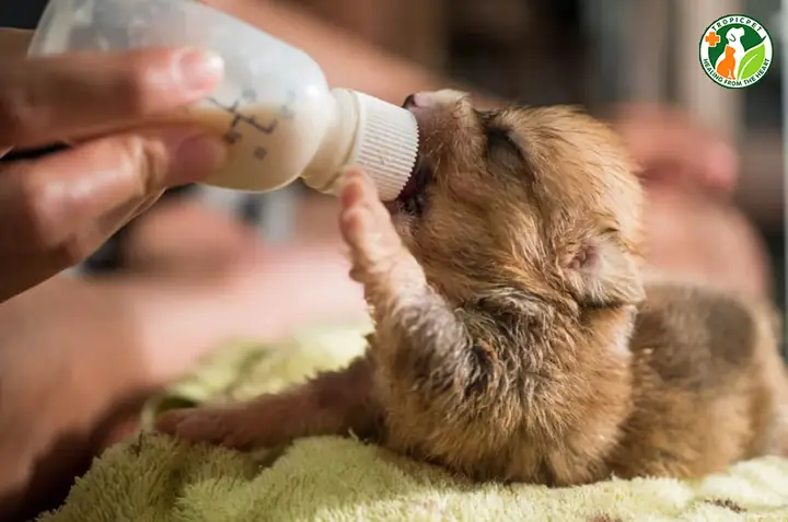 Cho bú đúng tư thế: Nâng đầu cún cao hơn thân khoảng 45 độ, bóp bình từ từ để sữa chảy đều. Lau miệng sạch sau bú và giữ sữa thừa trong tủ lạnh, làm ấm bằng ngâm nước nóng trước khi dùng lại nhé!