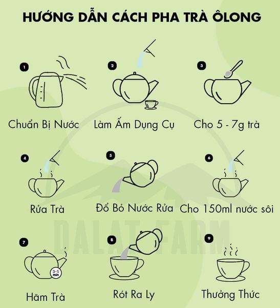 Khi pha, hãy dùng nước sôi khoảng 90-95°C và rót vào ấm trà với lá trà. Đợi khoảng ba phút cho trà thấm vị. Nếu muốn, bạn có thể ủ trà nhiều lần để khai thác hết hương vị phong phú của từng lần ngâm. Nhớ rằng trà Ô Long có thể được pha ít nhất sáu lần để trải nghiệm trọn vẹn tất cả sắc thái của nó. Thế là bạn đã sẵn sàng để thưởng thức một ly trà Ô Long thơm ngon rồi!