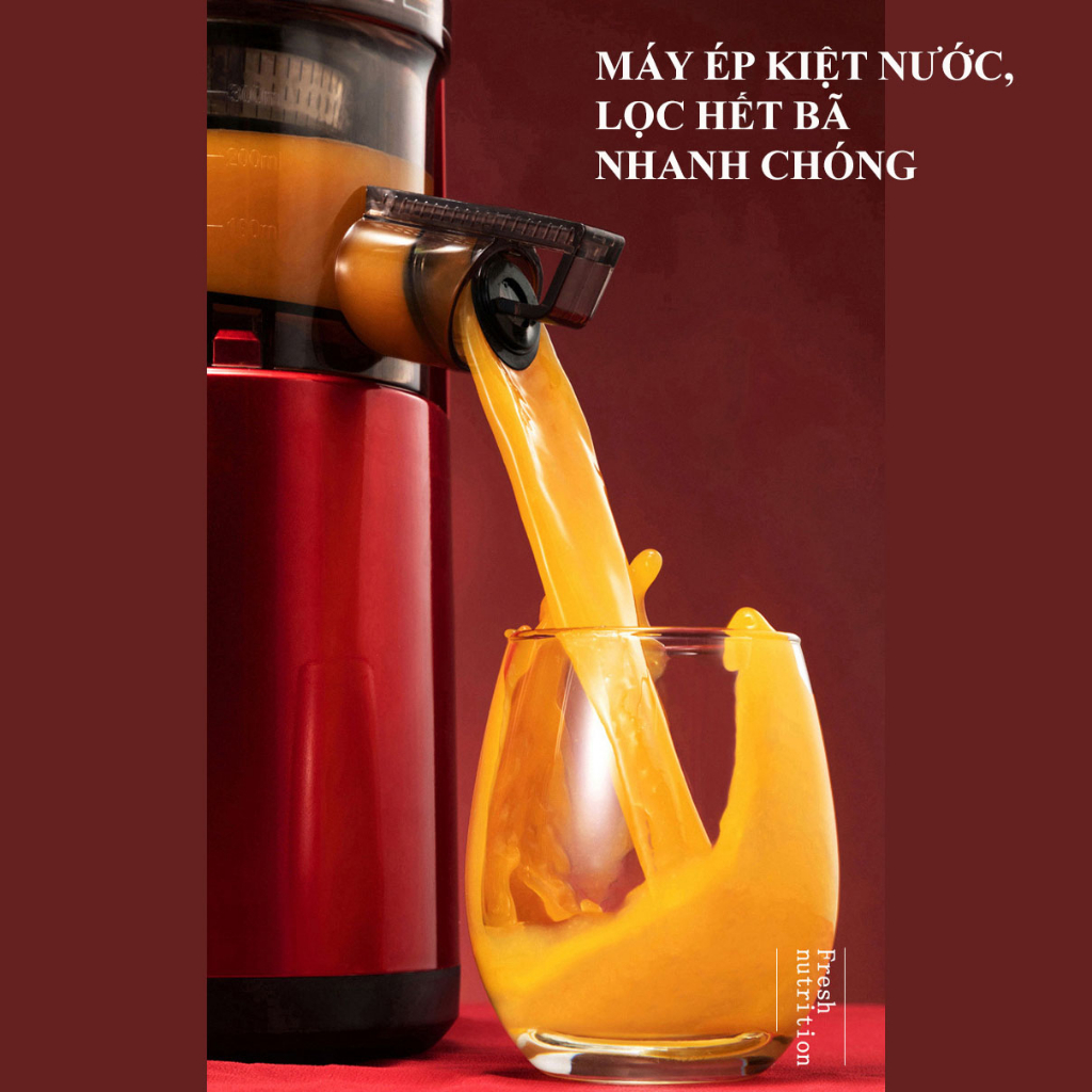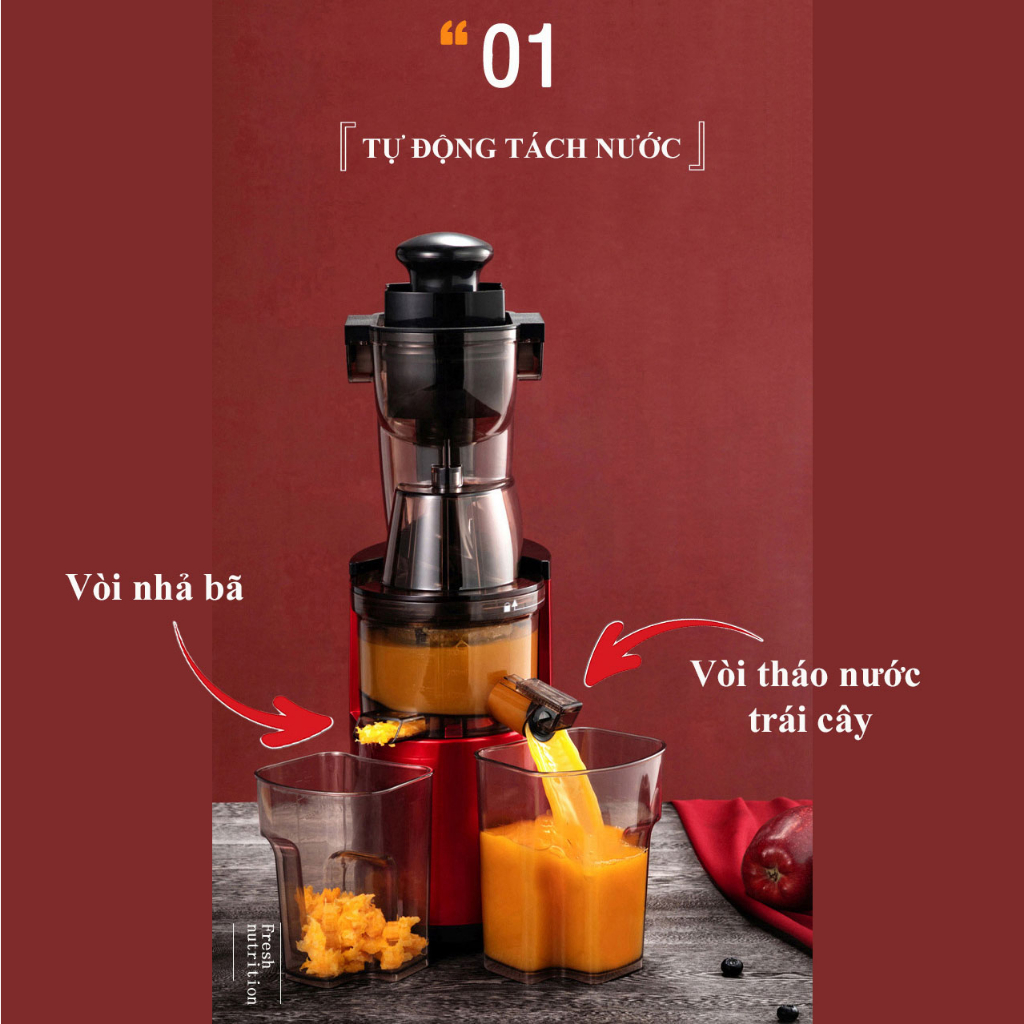 Một điểm nổi bật của máy ép này là ống tiếp nguyên liệu rộng rãi, cho phép bạn đưa nguyên trái vào mà không cần cắt nhỏ. Bạn chỉ cần lắp ráp các bộ phận, cắm điện, và bấm nút, sau đó thưởng thức thành phẩm ngay khi máy hoạt động. Thật dễ dàng và tiện lợi!