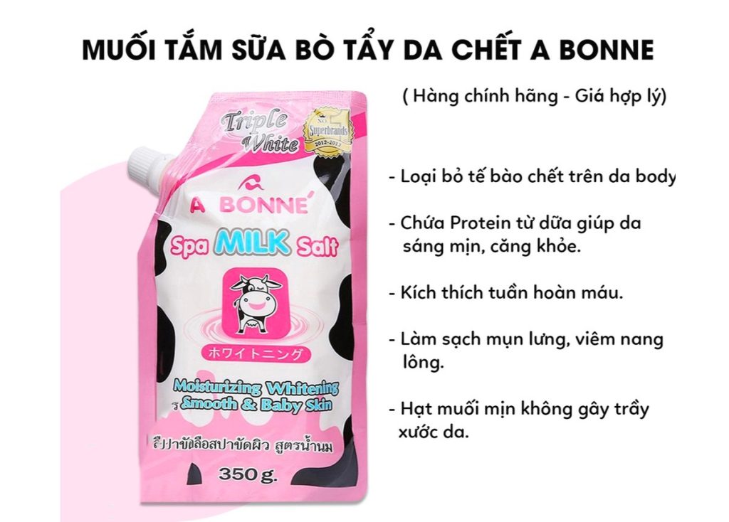 Nếu bạn đang tìm kiếm một sản phẩm tẩy tế bào chết hiệu quả, Muối Tắm A Bonne Spa Salt chắc chắn là lựa chọn không thể bỏ qua. Sản phẩm đến từ Thái Lan này không chỉ giúp làm sạch bụi bẩn và tế bào chết, mà còn hỗ trợ điều trị mụn lưng và viêm nang lông, đem lại cho bạn làn da hồng hào, mềm mịn hơn.