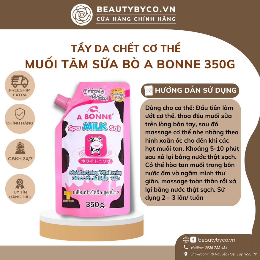 Muối tắm sữa bò A Bonne Thái Lan là một sản phẩm tuyệt vời cho những ai đang tìm kiếm cách chăm sóc da hiệu quả. Được cấu tạo từ muối tinh luyện và sữa bò, sản phẩm không chỉ giúp tẩy tế bào chết mà còn cung cấp độ ẩm cho làn da, làm cho da trở nên mềm mại và mịn màng.
