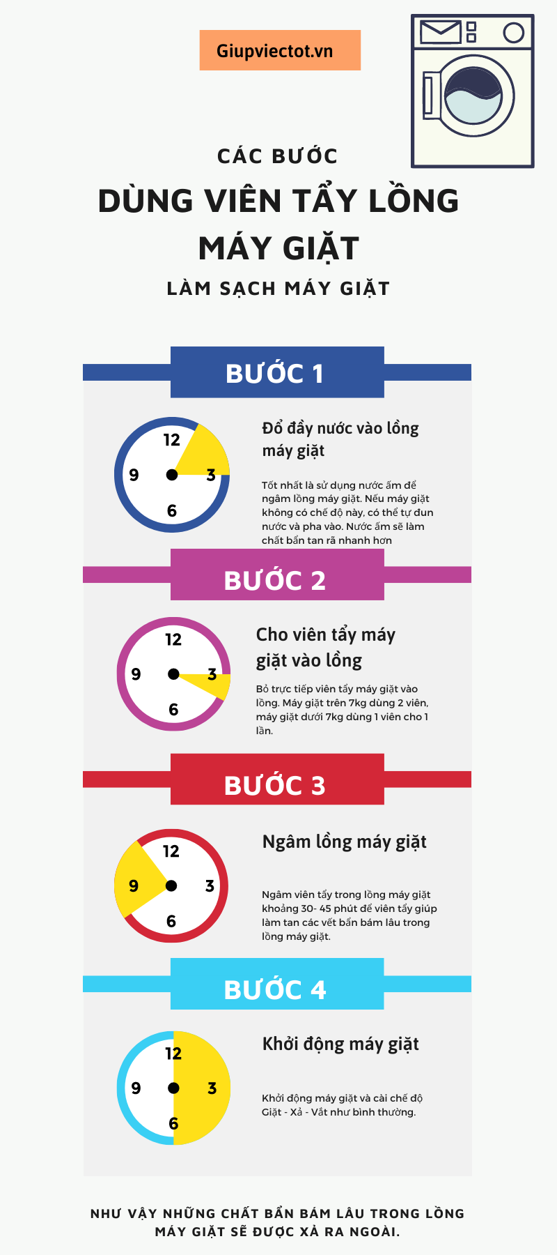 Khi dùng viên tẩy máy giặt, bạn nhớ đọc kỹ hướng dẫn trên bao bì trước nhé, vì mỗi loại có liều lượng riêng để tránh hỏng máy hay dư hóa chất.