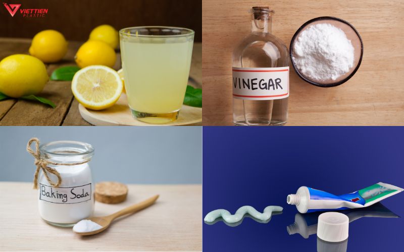 Một trong những phương pháp tự nhiên và hiệu quả là dùng nước cốt chanh. Chanh không chỉ giúp làm sạch mà còn khử mùi rất tốt. Ngoài ra, bạn cũng có thể sử dụng baking soda để loại bỏ các vết bẩn cứng đầu trên bề mặt đồ nhựa. Chỉ cần pha baking soda với một chút nước, tạo thành hỗn hợp sền sệt và chà nhẹ nhàng lên vùng cần tẩy.
