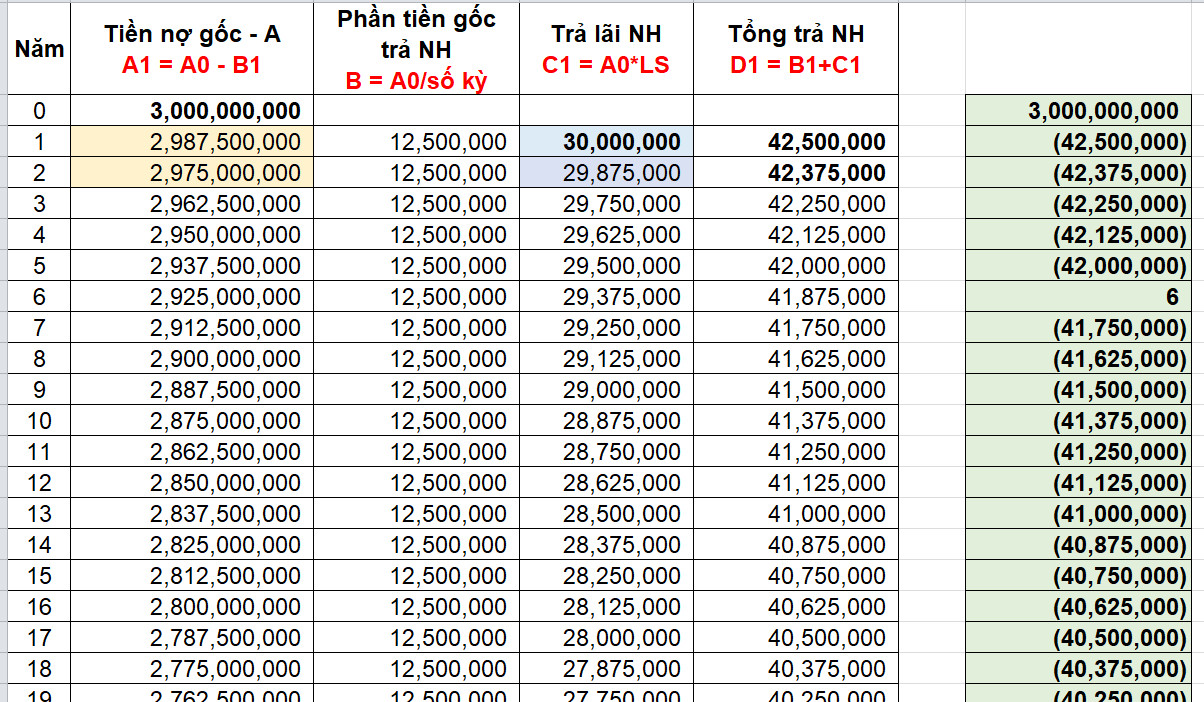 Ví dụ, nếu bạn vay 30 triệu đồng trong 12 tháng với lãi suất 12%/năm (tương đương 1%/tháng), thì tiền gốc hàng tháng là 2.5 triệu đồng. Tháng đầu bạn trả 2.5 triệu tiền gốc cộng 300 nghìn tiền lãi, tháng sau tiền lãi giảm dần theo số dư nợ còn lại.