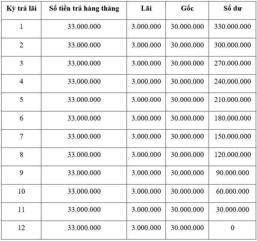 Cụ thể, tiền gốc hàng tháng sẽ được tính bằng cách chia số tiền vay cho thời hạn vay, tức là 1.000.000 VND chia cho 1 tháng, cho ra kết quả 1.000.000 VND. Tiền lãi tháng đầu tiên sẽ là số tiền vay nhân với lãi suất vay theo tháng, tức là 1.000.000 VND x 0,01, cho ra 10.000 VND.