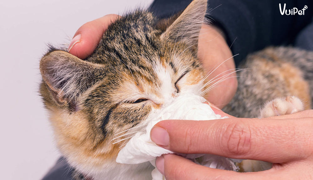 Nếu sổ mũi kèm ho, sốt hay thở khò khè, đưa bé đến bác sĩ thú y ngay để kiểm tra, vì có thể cần kháng sinh hoặc thuốc chuyên dụng. Còn không, dùng dung dịch vệ sinh mũi chuyên cho mèo nhỏ vài giọt hàng ngày sẽ giúp khử khuẩn hiệu quả.