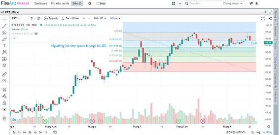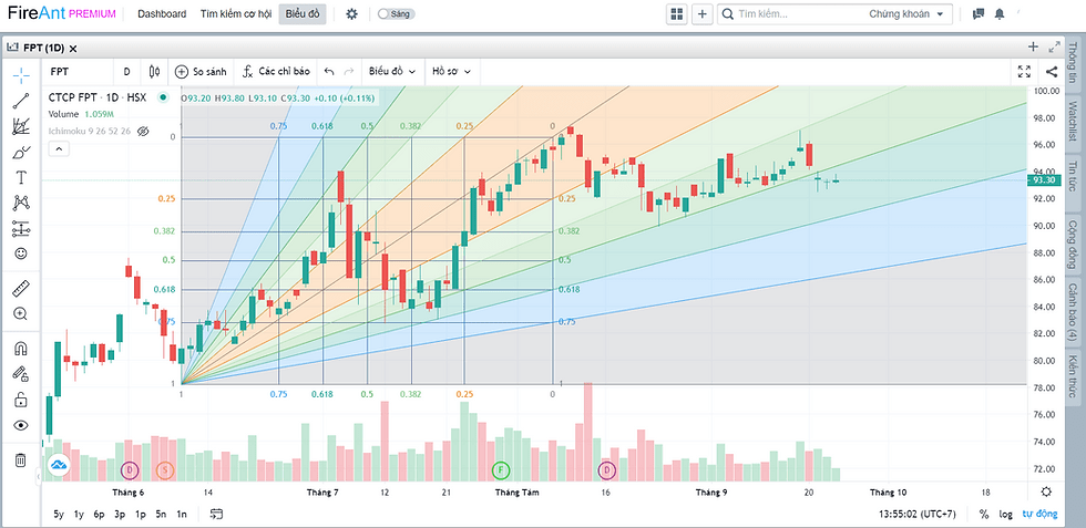 Để vẽ Fibonacci trên FireAnt, đầu tiên bạn cần xác định xu hướng chính của cổ phiếu hoặc tài sản mà bạn muốn phân tích, ví dụ như xu hướng tăng hoặc giảm rõ ràng trên biểu đồ. Sau đó, trên giao diện FireAnt, bạn chọn công cụ Fibonacci thoái lui có sẵn trong phần công cụ vẽ. Tiếp theo, bạn nhấn giữ chuột tại điểm bắt đầu của xu hướng (đỉnh hoặc đáy tùy theo xu hướng) rồi kéo thẳng đến điểm cuối của xu hướng đó. FireAnt sẽ tự động hiển thị các mức Fibonacci thoái lui như 23.6%, 38.2%, 50%, 61.8%… giúp bạn dễ dàng nhận biết các ngưỡng hỗ trợ và kháng cự tiềm năng trên biểu đồ giá.