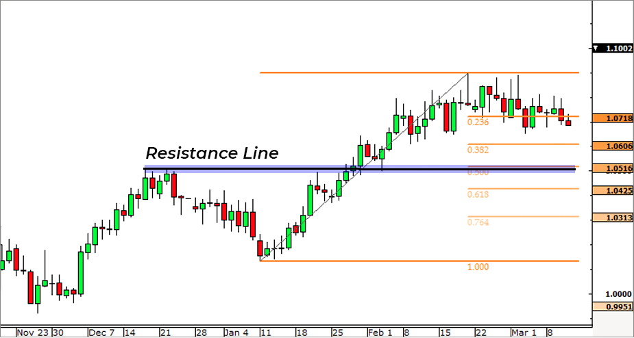 Tiếp theo, dựa trên các tỷ lệ Fibonacci cơ bản như 23.6%, 38.2%, 50%, 61.8% và 78.6%, bạn chia khoảng cách đó ra các mức tương ứng. Những mức này sẽ được vẽ thành các đường ngang trên biểu đồ, gọi là các mức hồi quy Fibonacci. Những đường này giúp bạn xác định các vùng hỗ trợ hoặc kháng cự tiềm năng, nơi giá có thể quay đầu hoặc tiếp tục xu hướng ban đầu.