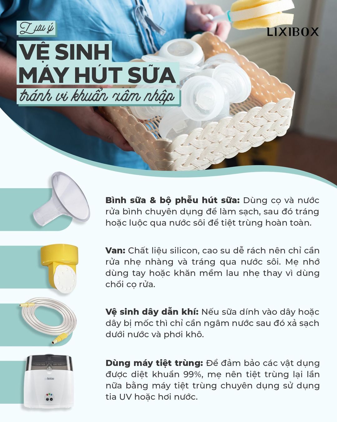 Vệ sinh máy hút sữa đúng cách đảm bảo an toàn vệ sinh.