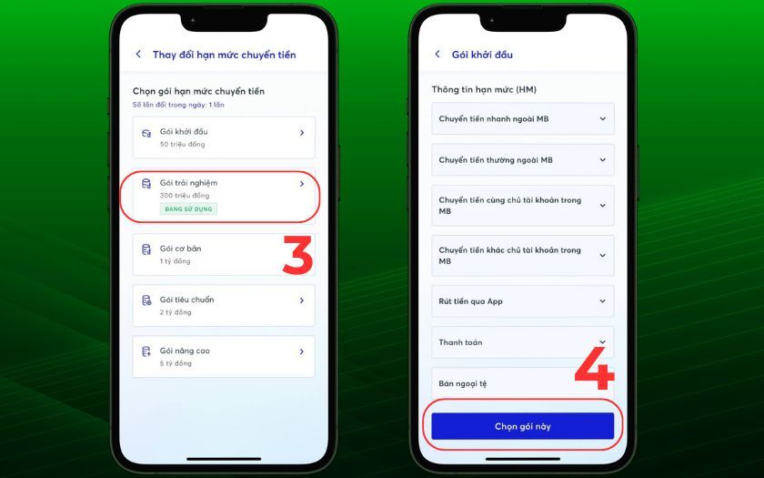 Nếu bạn đang là khách hàng của MBBank và muốn thay đổi hạn mức chuyển tiền online, thật đơn giản! Hiện nay, MBBank cung cấp ba gói dịch vụ với hạn mức chuyển tiền khác nhau. Gói cơ bản cho phép bạn chuyển tối đa 1 tỷ đồng mỗi ngày, trong khi gói tiêu chuẩn có hạn mức lên tới 2 tỷ đồng. Đặc biệt, với gói nâng cao, bạn có thể thoải mái chuyển số tiền lớn hơn, phù hợp với nhu cầu tài chính của mình.