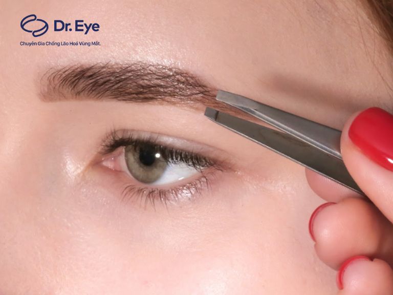 Khi nhổ lông bằng nhíp, nhổ từng sợi một ở phần nhạy cảm như bầu mắt, giữ da căng để giảm đau. Sau đó chải chổi xoắn cho mày tơi tự nhiên, thoa kem dưỡng dịu da.