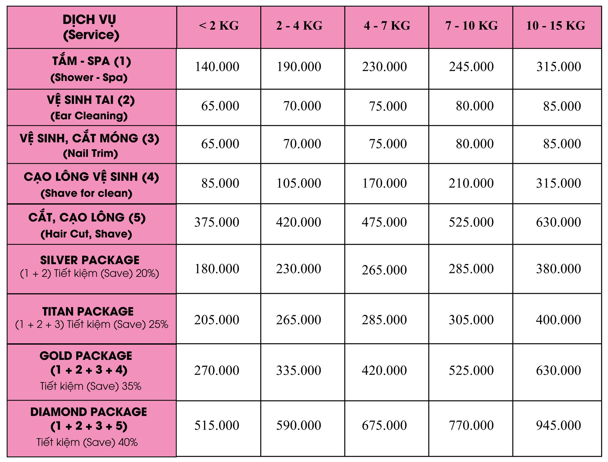 Nhiều spa thú cưng cung cấp gói dịch vụ trọn gói, bao gồm làm sạch sâu bằng công nghệ Ozon, nặn tuyến hôi, tỉa gọn lông mặt, tay, chân và tạo kiểu theo yêu cầu. Chi phí này thường cao hơn nhưng giúp mèo được chăm sóc toàn diện, lông mềm mượt và da khỏe mạnh hơn.