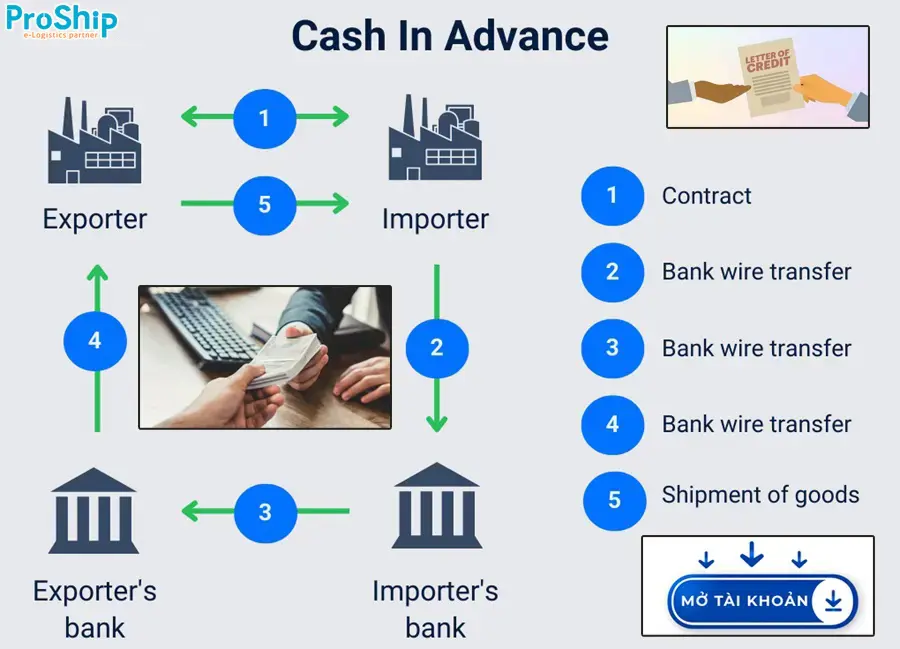 Một quy trình phổ biến trong thanh toán quốc tế là việc người nhập khẩu yêu cầu ngân hàng chuyển tiền cho người xuất khẩu trước khi hàng hóa được giao lên tàu. Ngân hàng nhập khẩu sẽ chuyển khoản cho ngân hàng xuất khẩu, từ đó đảm bảo tất cả các bên đều tuân thủ quy định. Các phương thức như T/T, nhờ thu D/A – D/P và tín dụng chứng từ L/C hiện đang được ưa chuộng và giúp cho việc giao dịch diễn ra an toàn hơn.