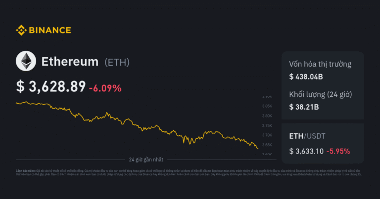 Ethereum (ETH) hiện đang giao dịch ở mức 3.631,02 USD, giảm 233,06 USD (6,03%) so với phiên trước đó. Trong ngày, giá đạt mức cao nhất là 3.869,94 USD và thấp nhất là 3.631,02 USD. Sự biến động này phản…