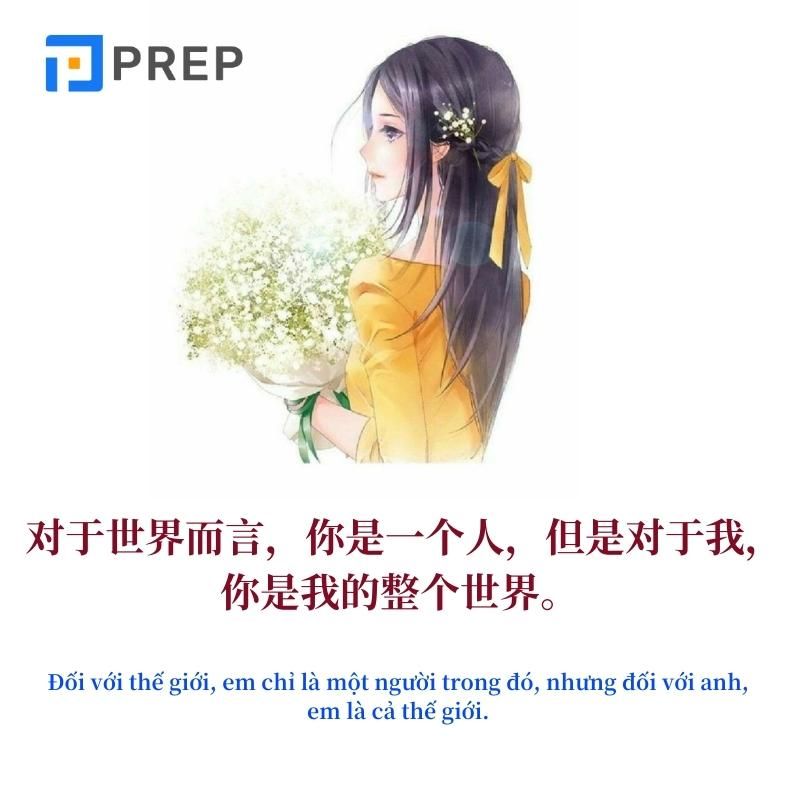 Ngoài ra, “对世界而言,你是一个人,但是对于我,你是我的整个世界” (Đối với thế giới, bạn chỉ là một người, nhưng đối với tôi, bạn là cả thế giới) thể hiện sức mạnh của tình yêu. Tình yêu chân thành có thể biến mọi thứ trở nên ý nghĩa và đầy sắc màu. Câu nói này nhấn mạnh rằng tình yêu có thể làm biến đổi cuộc sống.