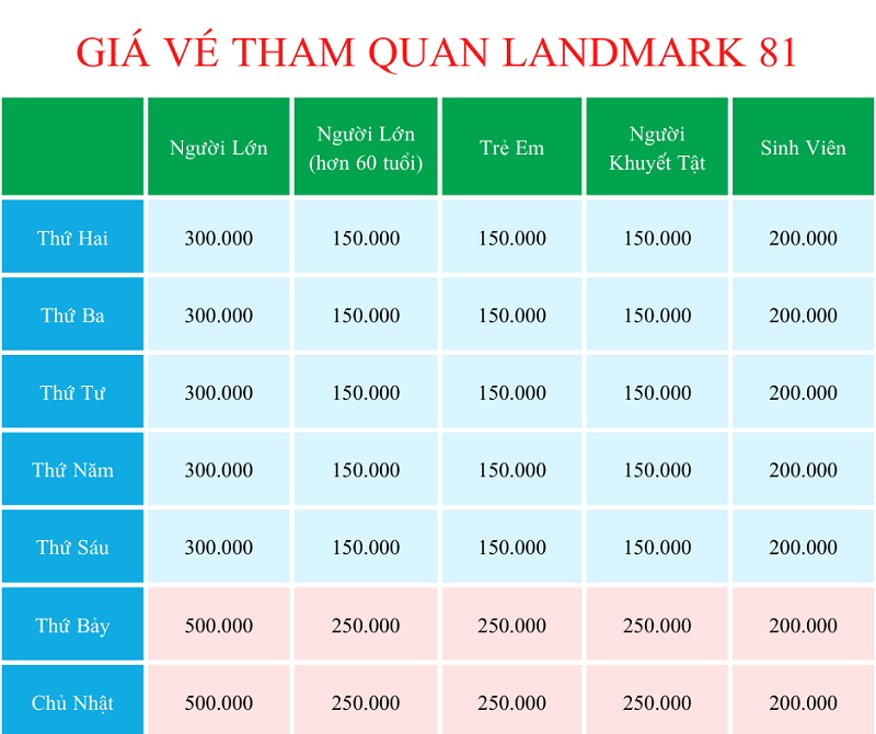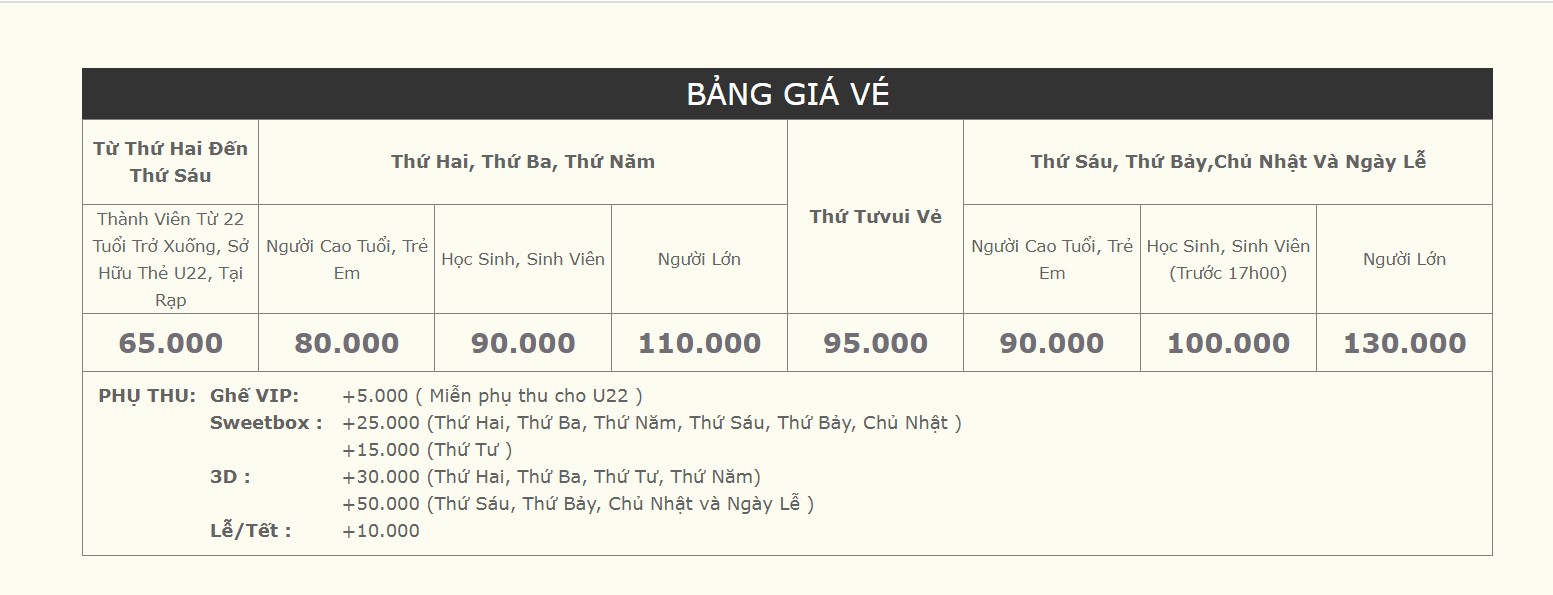 Bảng giá vé tại CGV Vincom Center Landmark 81 được phân theo đối tượng khách hàng và khung giờ chiếu phim, tạo điều kiện thuận lợi cho nhiều nhóm khách. Giá vé dành cho người lớn thường dao động từ 65.000 đến 105.000 đồng tùy vào ngày trong tuần và khung giờ chiếu. Các suất chiếu vào buổi sáng hoặc các ngày trong tuần thường có giá thấp hơn, khoảng 65.000 đồng, trong khi các suất chiếu buổi tối cuối tuần và ngày lễ có giá cao hơn, lên đến 105.000 đồng.