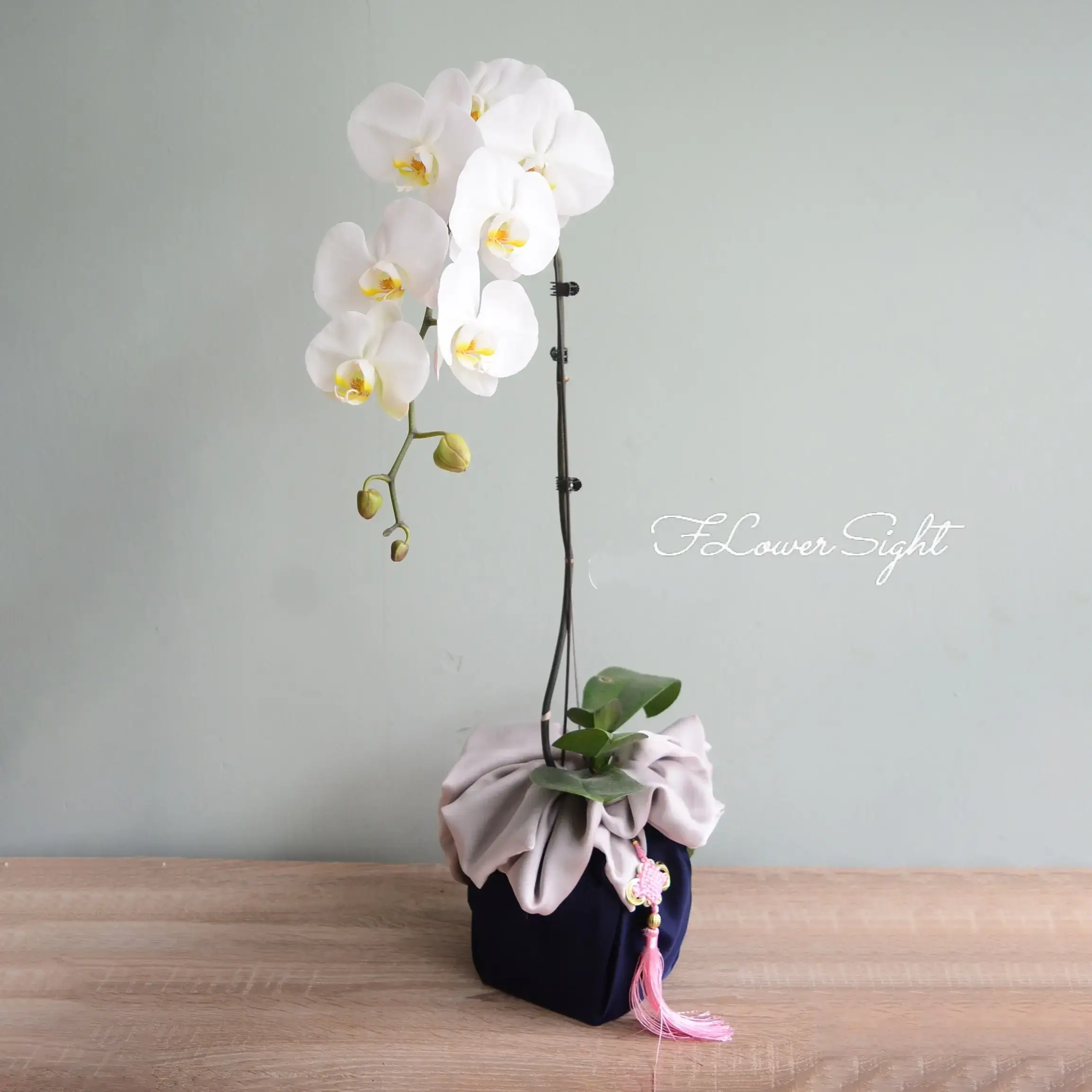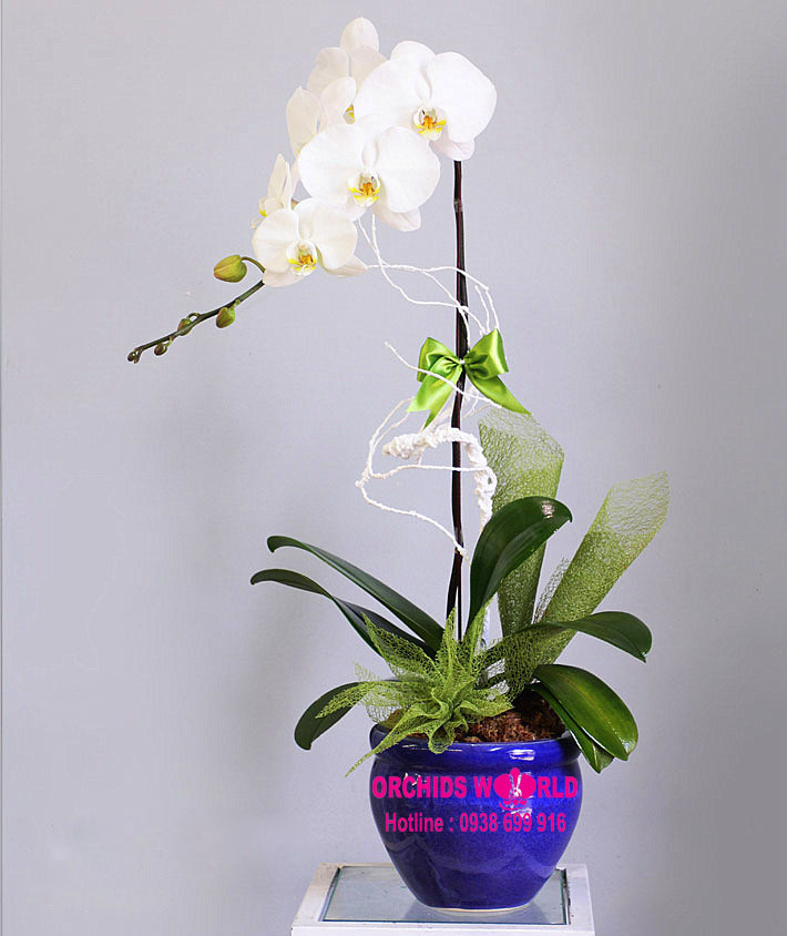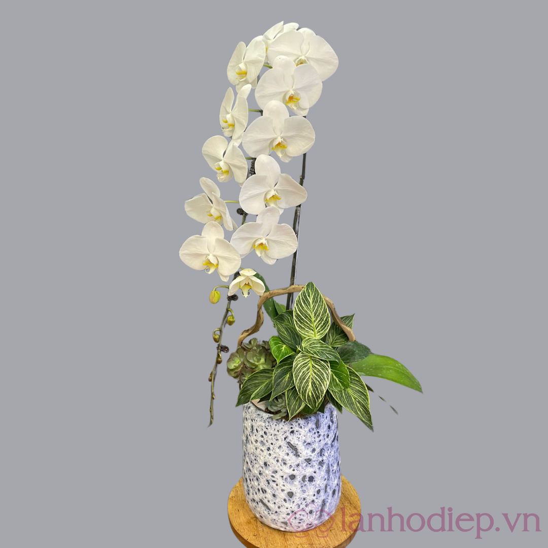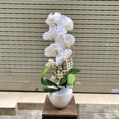 Mỗi bông hoa lan đều được chọn lựa kỹ càng, đảm bảo chất lượng cao nhất với những cánh hoa to, dày dạn và màu sắc trắng nhẹ nhàng. Chậu hoa được trang trí thêm các vật dụng nhỏ gọn, tăng thêm sự tinh tế mà không làm mất đi vẻ tự nhiên của hoa lan. Đây không chỉ là món quà tuyệt vời mà còn là biểu tượng của tài lộc và may mắn.