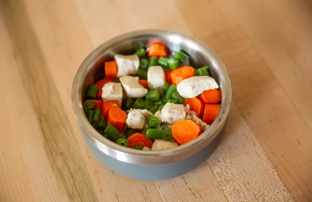 Tiếp theo, chuẩn bị rau củ như cà rốt, đậu Hà Lan hay khoai tây – cắt hạt lựu nhỏ để chó dễ nhai, tỷ lệ 50% thịt và 50% rau cho cân bằng. Xào cổ gà với dầu oliu nóng, thêm nội tạng gà cắt nhỏ và rau củ đảo đều 7-10 phút cho thấm vị. Hoặc hầm chung với nước xâm xấp trong 15 phút để mềm.