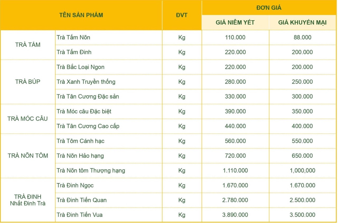 Trà đinh – loại chè cao cấp nhất, được tuyển chọn từ những búp non nhất, thường có giá dao động từ 1.500.000 đến 2.000.000 đồng/kg, thậm chí có những dòng thượng hạng như trà đinh Ngọc lên tới 2.500.000 đồng/kg. Trà nõn tôm, với hương vị thanh nhẹ, phù hợp cho người mới uống trà, có giá từ 900.000 đến 1.000.000 đồng/kg. Các loại trà móc câu, trà búp phổ thông hơn thì giá mềm hơn, chỉ từ 250.000 đến 650.000 đồng/kg tùy chất lượng.