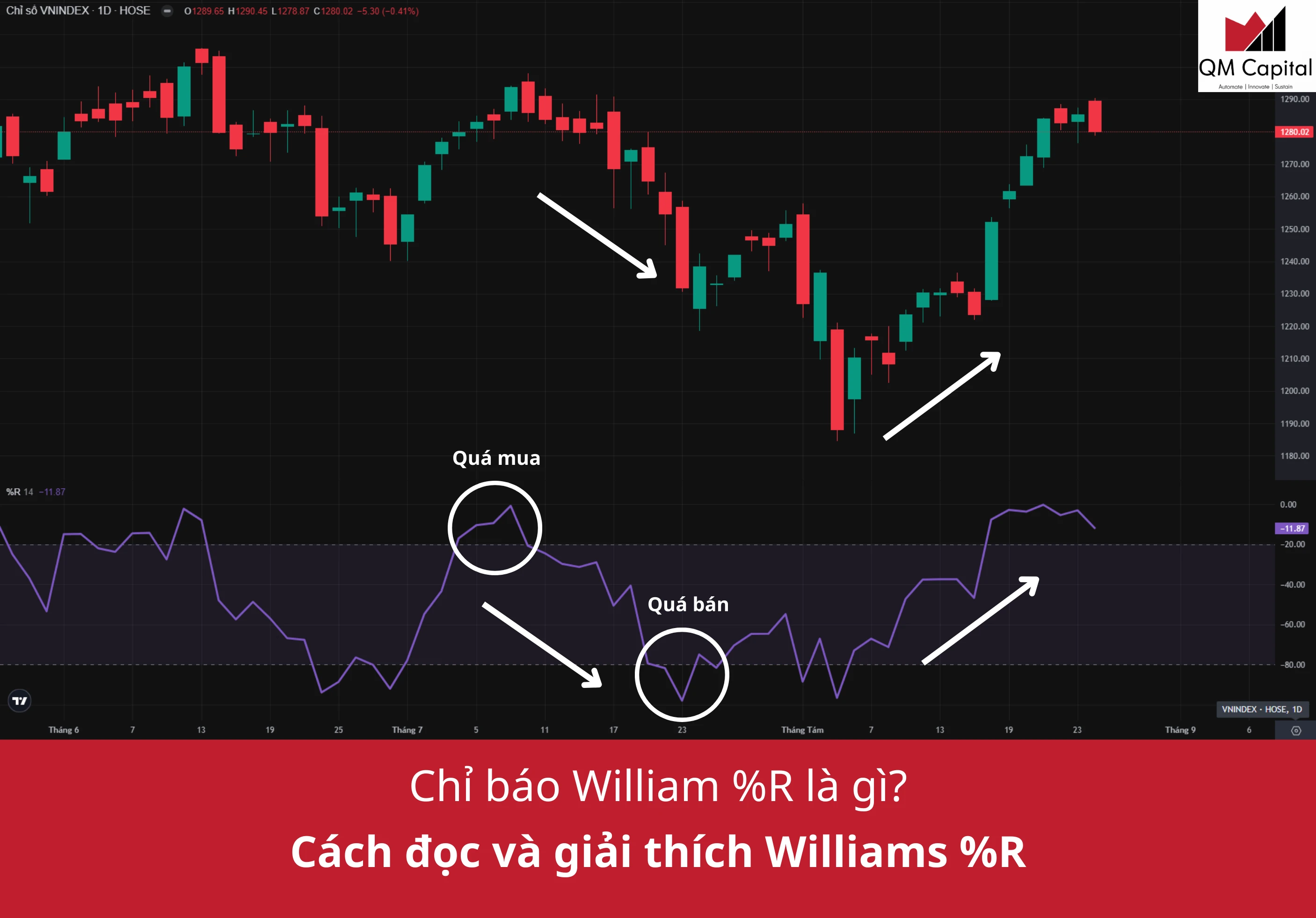 Williams Percent Range (Williams %R) là một chỉ báo động lượng giúp nhà đầu tư biết được vị trí giá đóng cửa cuối cùng so với mức giá cao nhất và thấp nhất trong một khoảng thời gian nhất định, thường là 14 phiên. Chỉ báo này dao động trong khoảng từ 0 đến -100, với các mức trên -20 báo hiệu thị trường có thể đang bị mua quá mức, còn dưới -80 cho thấy có thể bị bán quá mức.