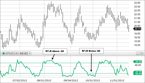 Williams %R dao động trong khoảng từ 0 đến -100, trong đó giá trị gần 0 thể hiện giá đóng cửa đang ở mức cao nhất trong chu kỳ, còn giá trị gần -100 cho thấy giá đóng cửa đang ở mức thấp nhất. Các mức -20 và -80 được xem là ngưỡng cảnh báo: khi chỉ báo vượt lên trên -20, thị trường được xem là quá mua, còn khi xuống dưới -80, thị trường bị quá bán.
