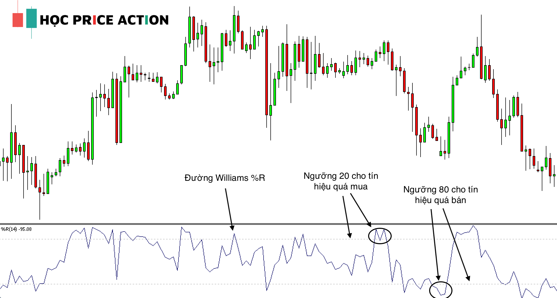 Cách đọc tín hiệu Williams %R khá đơn giản. Khi chỉ báo vượt lên trên mức -20, bạn có thể hiểu là thị trường đang có dấu hiệu mua quá mức, tức giá có thể sắp điều chỉnh giảm. Ngược lại, khi chỉ báo xuống dưới -80, thị trường có thể đang bán quá mức, báo hiệu khả năng giá sẽ bật tăng trở lại. Tuy nhiên, tín hiệu này không phải lúc nào cũng chính xác tuyệt đối, vì mua quá mức không đồng nghĩa giá sẽ giảm ngay, mà chỉ cho thấy giá đang ở đỉnh gần đây, tương tự với bán quá mức.