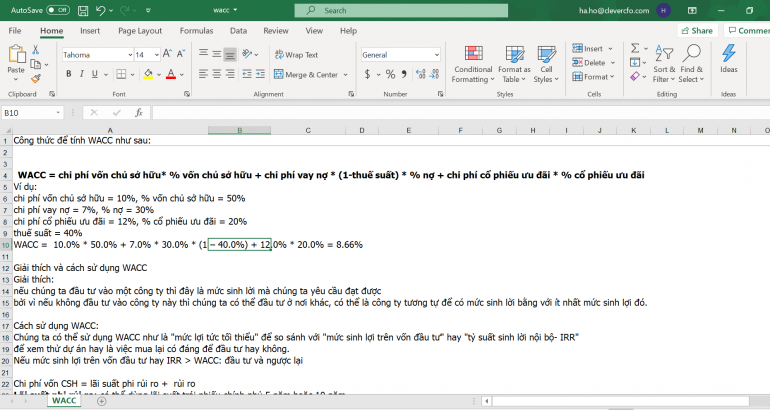 Cuối cùng, việc áp dụng chi phí sử dụng vốn bình quân không chỉ hỗ trợ trong việc hoạch định tài chính mà còn giúp doanh nghiệp nâng cao giá trị của mình trên thị trường. Việc hiểu rõ về WACC sẽ là công cụ hữu ích trong tay quản lý trong quá trình ra quyết định.