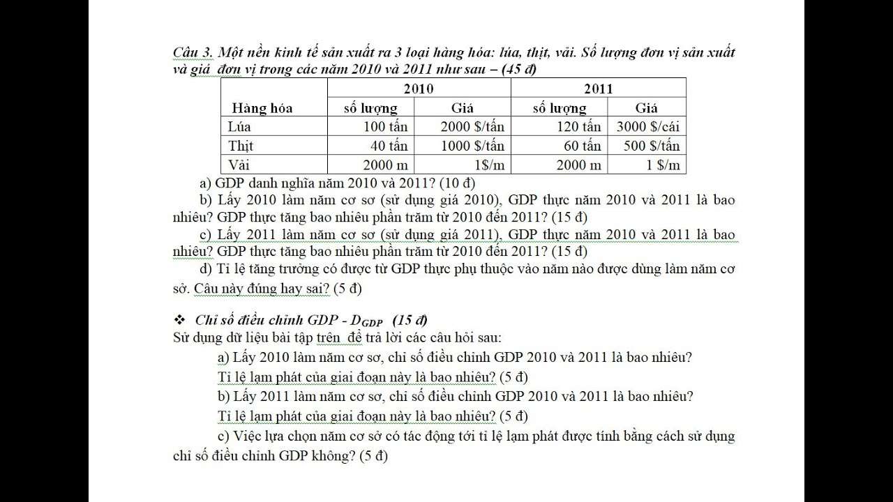 Ví dụ, nếu năm cơ sở chỉ số này là 100, thì những năm sau chỉ số trên 100 cho thấy giá cả đã tăng, còn dưới 100 là giá giảm. Qua bài tập, ta thường tính chỉ số điều chỉnh GDP từng năm để đánh giá tốc độ lạm phát hoặc giảm phát trong nền kinh tế. Từ đó, có thể tính tỷ lệ lạm phát bằng cách so sánh chỉ số điều chỉnh GDP giữa các năm liên tiếp.