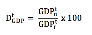 Cách tính chỉ số này khá đơn giản: ta lấy GDP danh nghĩa (tính theo giá hiện hành) chia cho GDP thực tế (tính theo giá năm cơ sở), rồi nhân với 100. Ví dụ, nếu GDP danh nghĩa năm nay là 1,2 nghìn tỷ USD còn GDP thực tế là 1 nghìn tỷ USD, thì chỉ số điều chỉnh GDP sẽ là 120, nghĩa là mức giá chung đã tăng 20% so với năm cơ sở.