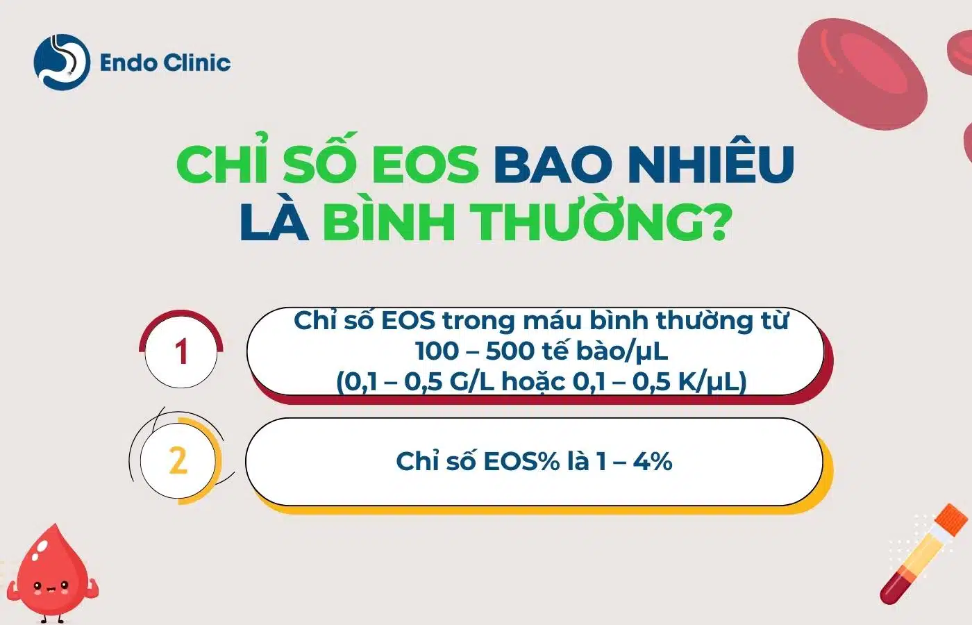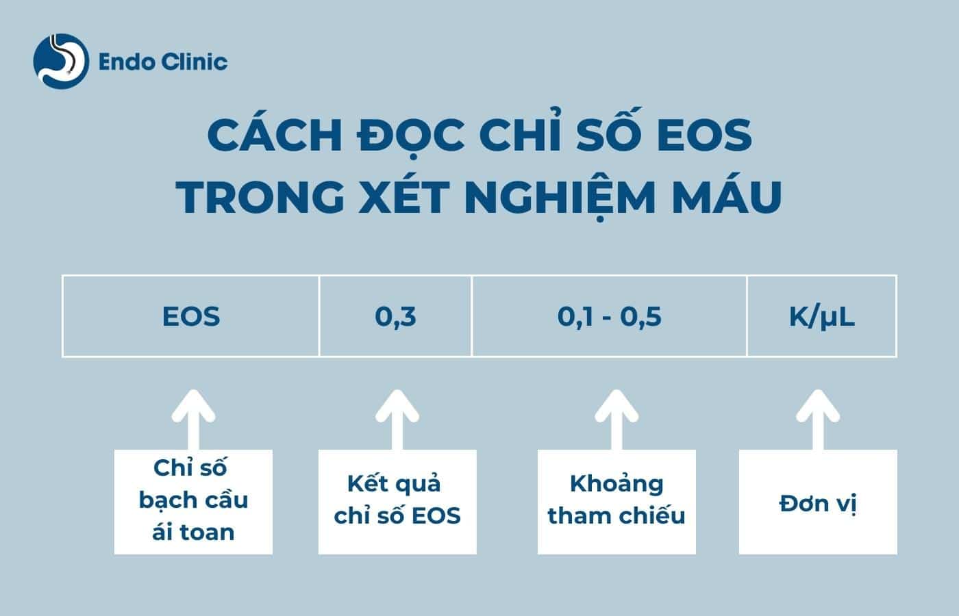 Chỉ số EOS bình thường thường nằm trong khoảng 100 – 500 tế bào/μL (0.1 – 0.5 G/L). Nếu chỉ số này tăng cao, có thể cảnh báo cơ thể đang bị nhiễm ký sinh trùng, dị ứng hoặc một số bệnh lý liên quan đến hệ miễn dịch. Ngược lại, chỉ số quá thấp cũng có thể phản ánh tình trạng suy giảm miễn dịch. Vì vậy, khi nhận kết quả xét nghiệm máu có chỉ số EOS bất thường, bạn nên tham khảo ý kiến bác sĩ để được tư vấn và điều trị phù hợp.