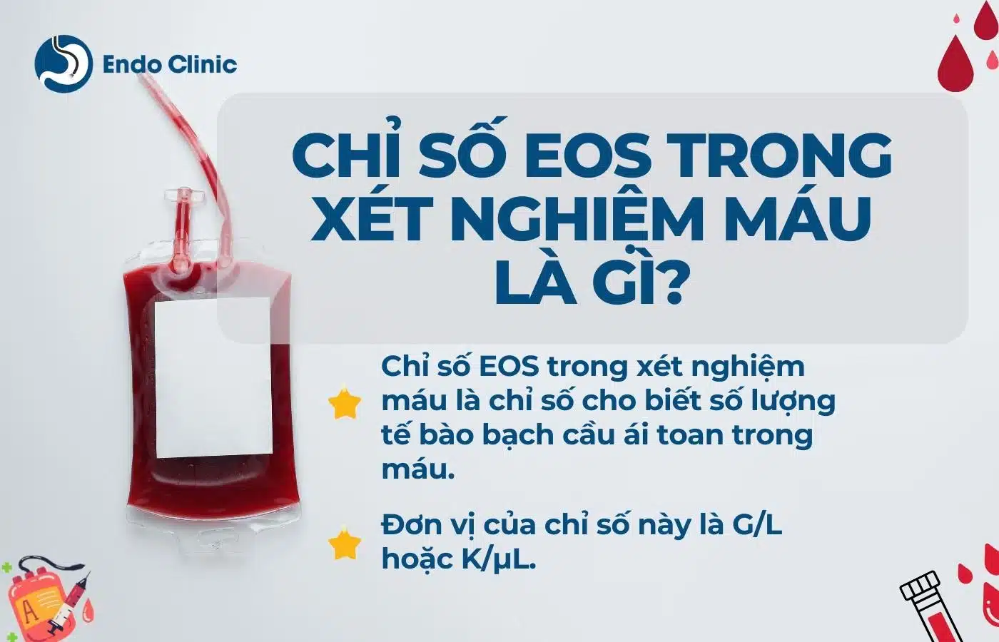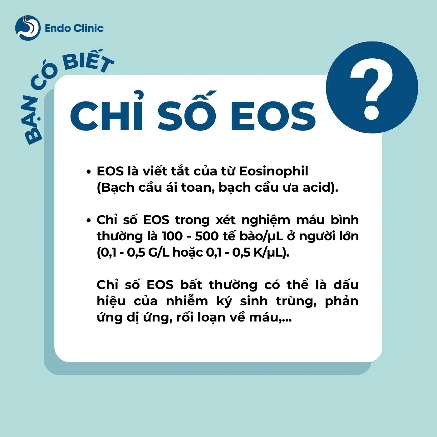 Chỉ số EOS (Eosinophil) thấp không phải lúc nào cũng là dấu hiệu nguy hiểm. EOS là một loại bạch cầu giúp cơ thể chống lại ký sinh trùng và tham gia vào phản ứng dị ứng. Khi chỉ số EOS thấp hơn mức bình thường, nếu các chỉ số máu khác vẫn ổn định và không có triệu chứng bất thường, thì bạn không cần quá lo lắng. Đây có thể chỉ là sự dao động bình thường của cơ thể hoặc do yếu tố sinh lý.
