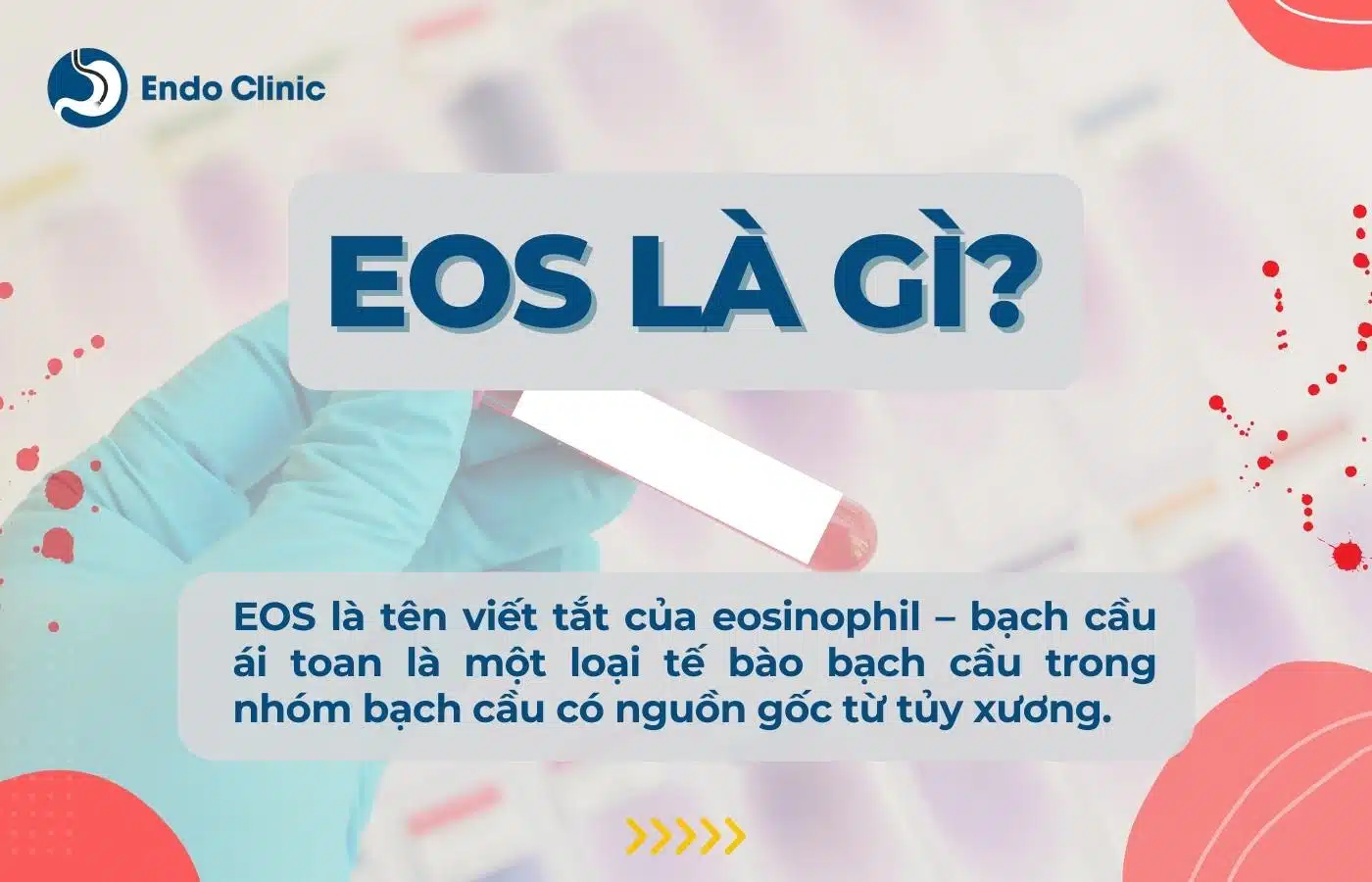 Eos là viết tắt của Eosinophil, hay còn gọi là bạch cầu ái toan – một loại tế bào bạch cầu quan trọng trong hệ miễn dịch của cơ thể. Chức năng chính của Eos là tham gia vào phản ứng miễn dịch, đặc biệt là khi cơ thể gặp các tình trạng dị ứng hoặc nhiễm ký sinh trùng. Khi cơ thể bị dị ứng hoặc nhiễm ký sinh trùng, số lượng bạch cầu ái toan thường tăng lên để giúp chống lại các tác nhân gây hại này.
