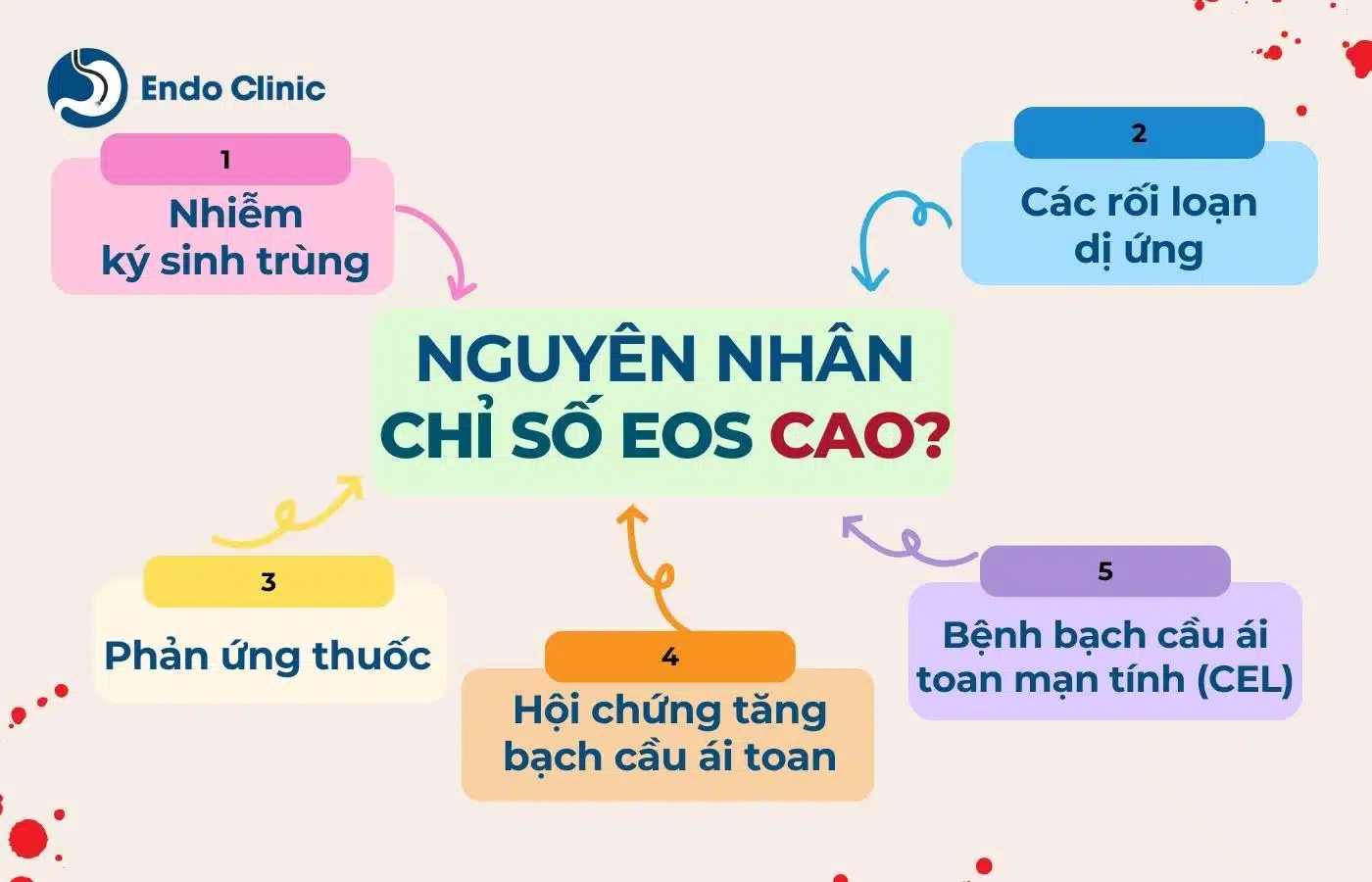 Việc tăng EOS không phải lúc nào cũng đồng nghĩa với bệnh nghiêm trọng, vì nó còn phụ thuộc vào triệu chứng và tiền sử bệnh của người bệnh. Một số loại thuốc như kháng sinh, thuốc an thần, hoặc thuốc điều trị nhiễm trùng cũng có thể làm tăng chỉ số này, nên bác sĩ thường sẽ xem xét kỹ lưỡng trước khi đưa ra chẩn đoán cuối cùng.