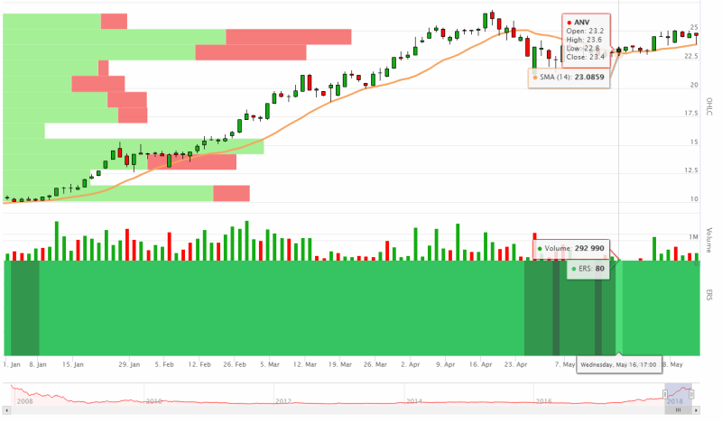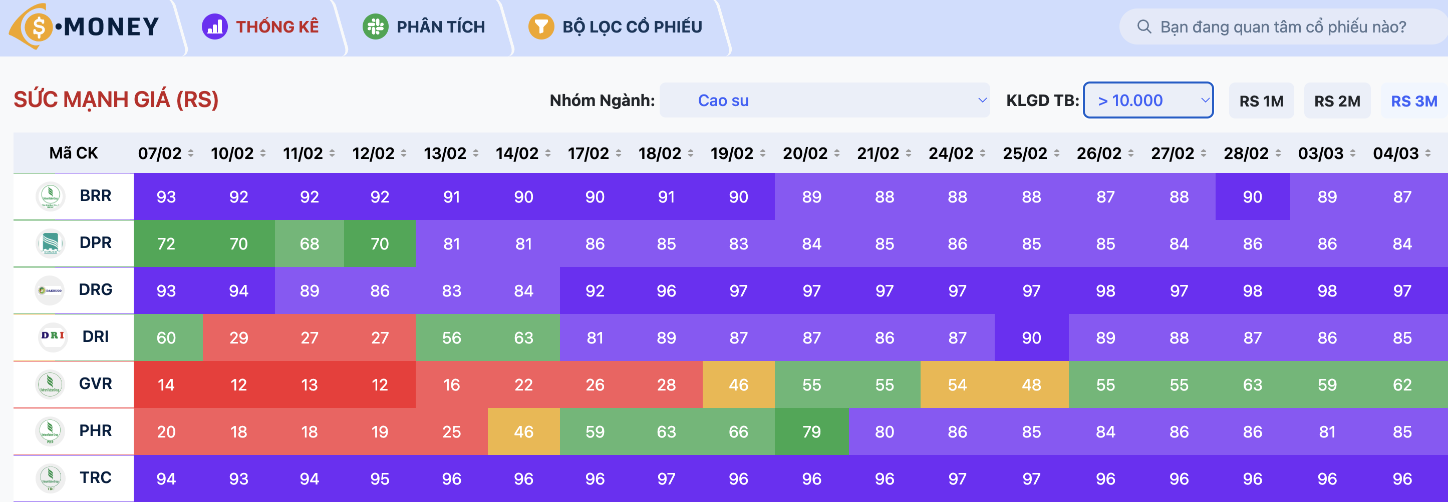 Chẳng hạn, khi RS đạt từ 70 trở lên, cổ phiếu sẽ được đánh giá cao hơn các cổ phiếu khác. Những cổ phiếu trong khoảng RS từ 70-80 được tô màu xanh nhạt, trong khi từ 80-85 là xanh đậm, và cao hơn sẽ là màu tím nhạt. Điều này giúp nhà đầu tư dễ dàng hình dung và nắm bắt những cơ hội.
