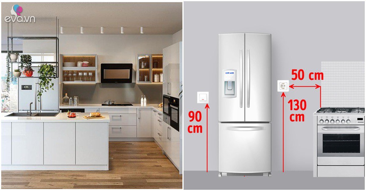 Về vị trí lắp đặt, hãy chọn một nơi phù hợp, tránh xa nơi có độ ẩm cao như nhà tắm hoặc gần bình gas. Nên đặt ổ cắm điện cho tủ lạnh ở phía sau, cách mặt sàn từ 90-130 cm để không làm rối dây điện và dễ dàng truy cập. Nếu có thiết bị khác như lò vi sóng, hãy bố trí ổ cắm cho nó ở vị trí phù hợp để tránh quá tải cho nguồn điện.
