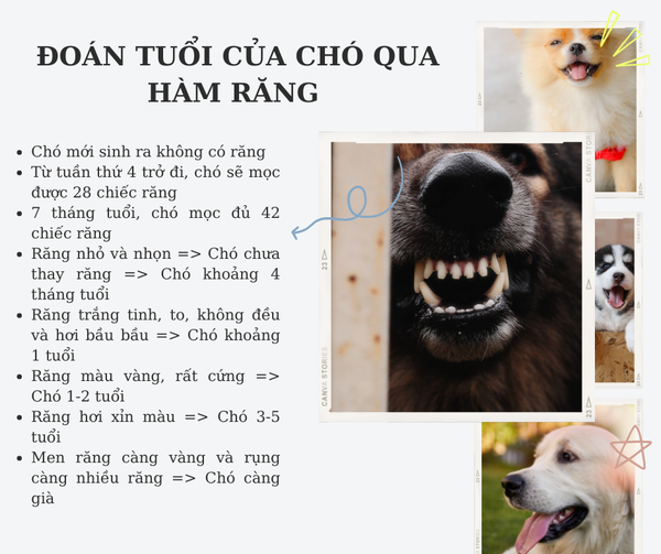 Khi nhìn vào chú chó nhà mình, bạn có thể dễ dàng đoán tuổi của nó chỉ bằng cách quan sát kỹ một vài chi tiết nhỏ. Điều đầu tiên và quan trọng nhất là nhìn vào hàm răng của chó. Nếu răng trắng tinh, to và hơi bầu bầu, chó của bạn khoảng 1 tuổi. Khi răng bắt đầu có màu vàng, chó đã vào độ tuổi 1-2 năm. Còn nếu thấy răng xỉn màu, ố vàng hoặc thậm chí bắt đầu rụng, chó của bạn đã bước vào giai đoạn 3-5 tuổi trở lên.