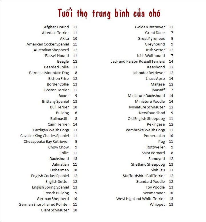 Chó nhỏ như Chihuahua hay Pug thường “dai sức” hơn, có thể sống tới 12-20 năm, trong khi chó lớn như Great Dane hay Rottweiler chỉ khoảng 7-10 năm. Ở Việt Nam, chó Phú Quốc hay chó ta có thể đạt 12-17 năm nếu được nuôi tốt.