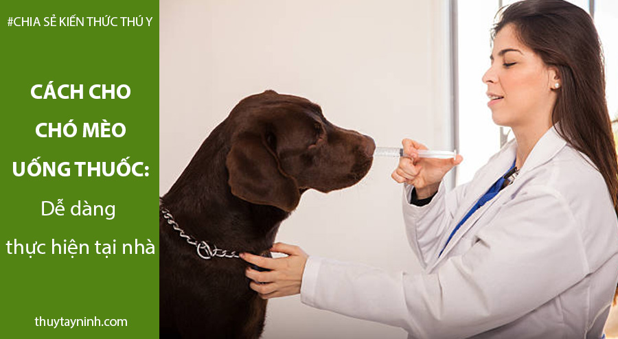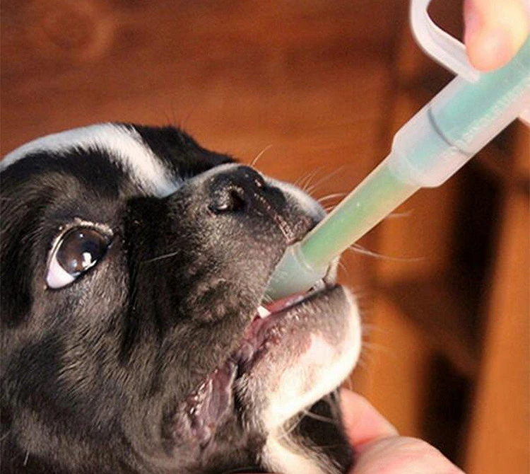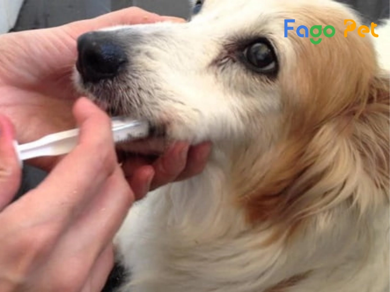 Thuốc nước thì dùng ống tiêm: bơm chậm rãi vào khe giữa má và răng hàm, chia nhỏ liều và chờ chó nuốt hết trước khi bơm tiếp để tránh sặc. Nâng nhẹ đầu bé và xoa mũi giúp nuốt tốt hơn.