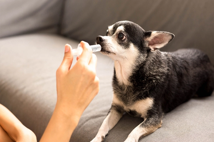 Chó uống thuốc bằng xilanh trong không gian yên tĩnh