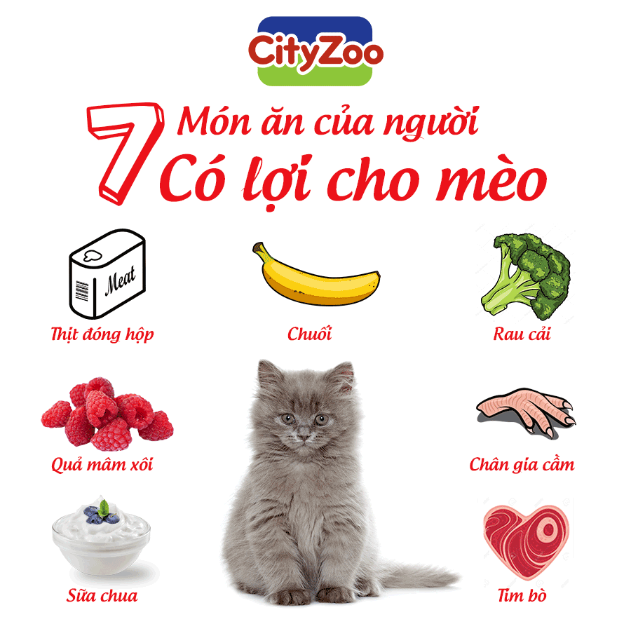 Thịt gà tươi giàu protein giúp cơ bắp, da lông mịn màng; gan gà bổ sung vitamin B12, kẽm tăng đề kháng. Cá biển cung cấp taurine tốt cho não bộ, mắt sáng và lông óng ả. Sữa chua không đường cũng là món yêu thích, hỗ trợ tiêu hóa.