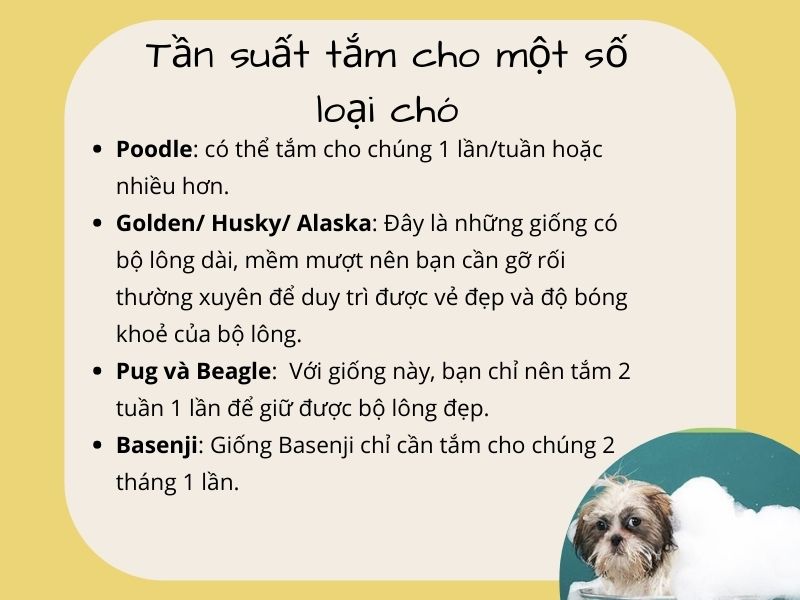 Mùa hè oi bức, bé chơi đùa ngoài trời nhiều thì có thể tăng lên 2-3 lần/tuần, nhưng mùa đông giảm xuống 1-2 lần để da không bị nứt nẻ. Quan sát bé hàng ngày: lông bết, mùi hôi hay dính bùn thì tắm ngay, đừng chờ lịch cố định.