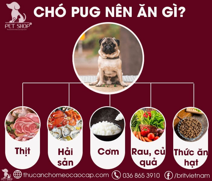 Chó Pug mặt xệ nhà mình dễ thương lắm, nhưng chế độ ăn cần cẩn thận vì chúng hay tham ăn và dễ béo phì. Thức ăn chính nên giàu protein từ thịt bò, gà, cá, trứng hay nội tạng, kết hợp chất béo từ mỡ cá, mỡ gà để bé khỏe mạnh, lông bóng.