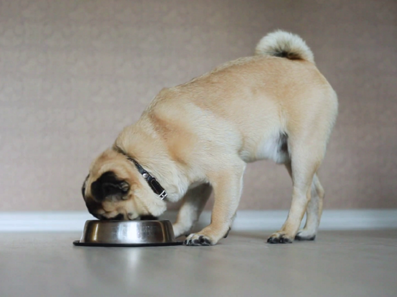 Pug trưởng thành chỉ cần 2 bữa cơm trộn mỗi ngày, kết hợp protein từ thịt, cá, trứng, nhưng tuyệt đối tránh xương gà, xương heo vì hàm ngắn dễ bị nghẹn.