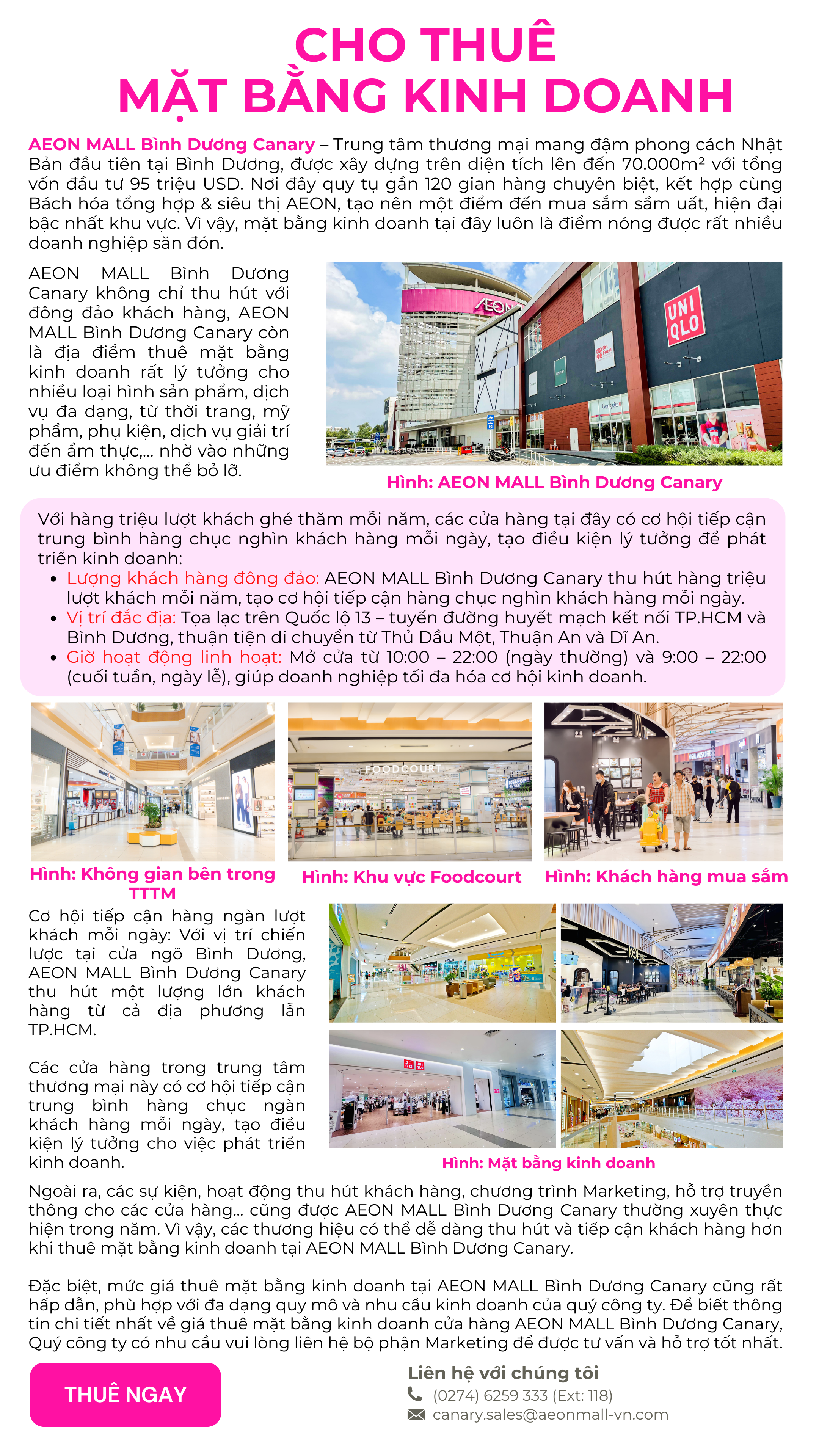 Khi quyết định thuê mặt bằng tại AEON MALL Bình Dương, doanh nghiệp sẽ có cơ hội khai thác tiềm năng vô cùng lớn từ việc nằm trong một trung tâm thương mại hiện đại và sầm uất. Với tổng diện tích lên tới 70.000m² và hơn 120 gian hàng, AEON MALL Bình Dương Canary không chỉ mang đến không gian mua sắm phong phú cho khách hàng mà còn tạo ra một trải nghiệm đa dạng, từ thời trang, mỹ phẩm cho đến ẩm thực Nhật Bản độc đáo. Vị trí đắc địa trên Đại lộ Bình Dương càng làm tăng khả năng tiếp cận và thu hút đông đảo khách hàng.