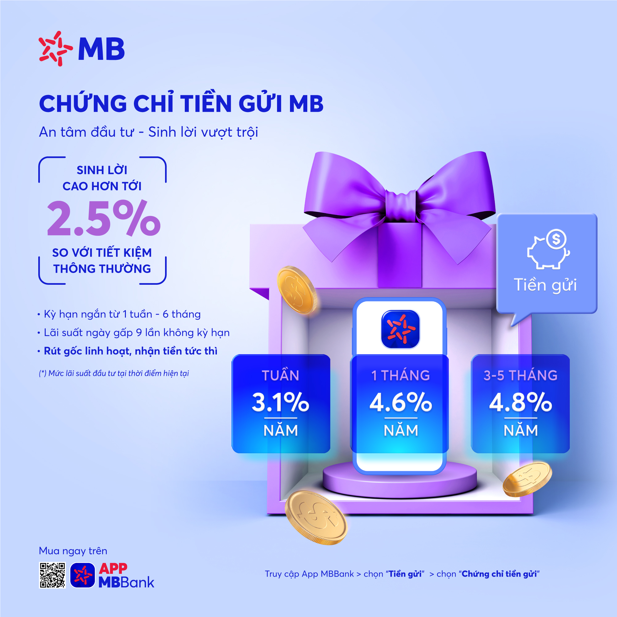 Chứng chỉ tiền gửi tại Ngân hàng MB là một lựa chọn hấp dẫn cho những ai đang tìm kiếm một cách đầu tư an toàn và sinh lời. Với lãi suất cạnh tranh, cao hơn so với tiền gửi thông thường, bạn có thể yên tâm rằng số tiền của mình sẽ sinh trưởng tốt theo thời gian.