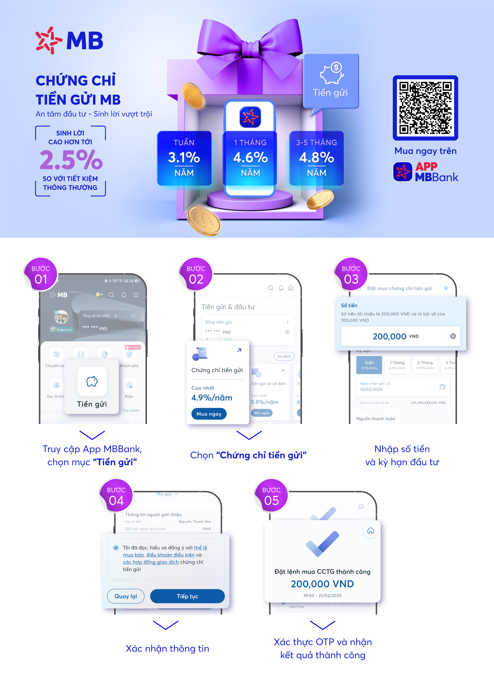 Trong bối cảnh nhu cầu đầu tư an toàn ngày càng tăng cao, chứng chỉ tiền gửi MB (Ngân hàng Quân Đội) đã trở thành lựa chọn hấp dẫn dành cho nhiều khách hàng. Tuy cùng mục đích sinh lời như sổ tiết kiệm, chứng chỉ tiền gửi MB lại sở hữu những ưu điểm vượt trội về lãi suất, tính bảo mật và linh hoạt trong quá trình đầu tư. Vậy chứng chỉ tiền gửi MB là gì, có những loại nào, mua ở đâu, thủ tục ra sao và so với hình thức gửi tiết kiệm truyền thống có gì khác biệt? Bài viết dưới đây sẽ giúp bạn giải đáp toàn bộ những thắc mắc trên về chứng chỉ tiền gửi MB.