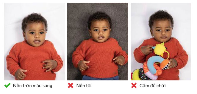 Bên cạnh kích thước, phông nền của ảnh cũng rất quan trọng. Ảnh cần chụp trên nền trắng, không có họa tiết nào và để ánh sáng tự nhiên giúp khuôn mặt của trẻ sáng rõ. Đặc biệt, trẻ sẽ cần phải có đầu để trần, không được đeo kính và mặt phải nhìn thẳng ra phía trước để có vẻ tự nhiên nhất.