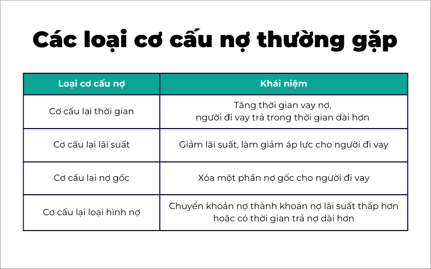 Điều này thường bao gồm việc điều chỉnh kỳ hạn trả nợ, gia hạn thời gian nợ hoặc thay đổi lãi suất. Việc tái cơ cấu nợ không chỉ giúp người vay có cơ hội duy trì hoạt động tài chính mà còn thể hiện sự linh hoạt từ phía ngân hàng hoặc tổ chức tín dụng.