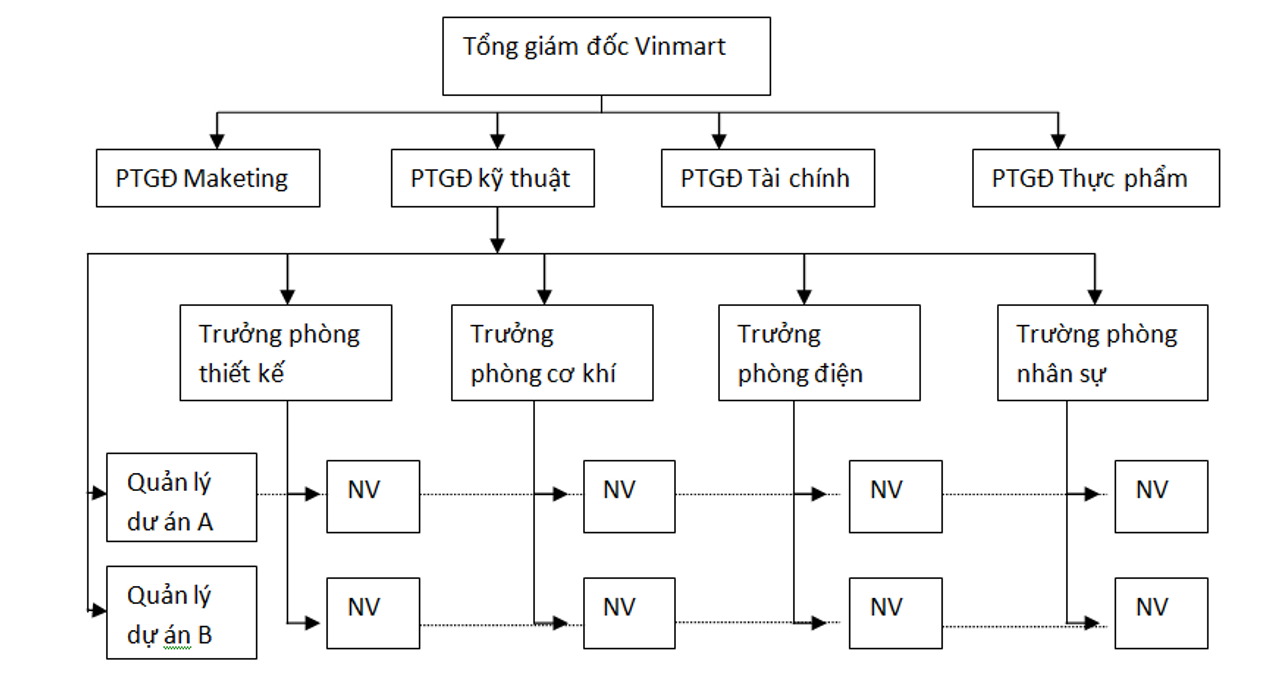 Cơ cấu tổ chức của VinMart, hệ thống siêu thị nổi tiếng tại Việt Nam, được xây dựng theo mô hình ma trận. Mô hình này cho phép tổ chức linh hoạt và hiệu quả hơn trong việc phân bổ nguồn lực và điều phối công việc. Mỗi bộ phận chức năng sẽ làm việc song song với nhau, tạo ra sự tương tác và hỗ trợ lẫn nhau.