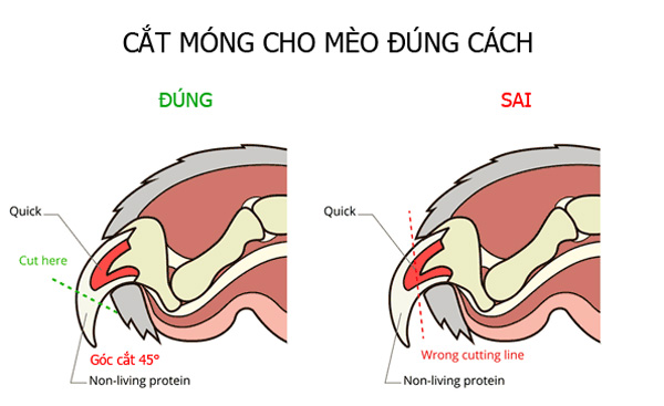 Để cắt an toàn, hãy cắt ở góc 45 độ và giữ móng ở tư thế tự nhiên. Cách này giúp tránh gây tổn thương và giữ cho móng vẫn chắc chắn sau khi cắt. Nếu móng mèo quá sẫm màu, bạn có thể dùng đèn pin soi để nhìn rõ vùng tủy móng.
